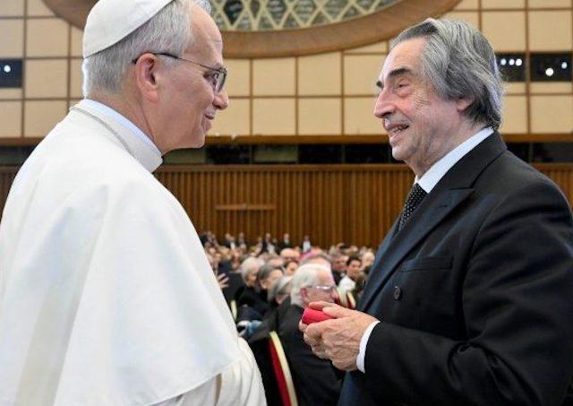 Pápež pripomenul slová Benedikta XVI., ktorý zdôrazňoval, že „pravá krása preniká srdce, otvára a rozširuje ho“, a že v hudbe hľadal hlas Boha v stvorenom vesmíre. Pripomenul aj osobný vzťah medzi kardinálom Josephom Ratzingerom a maestrom Mutim, ktorý sa začal na koncertoch v Salzburgu a Mníchove a pokračoval v Ríme, vrátane odovzdania Veľkého kríža svätého Gregora Veľkého. Dnešné ocenenie je podľa pápeža pokračovaním tohto dialógu, otvoreného tajomstvu a zameraného na spoločné dobro a harmóniu.