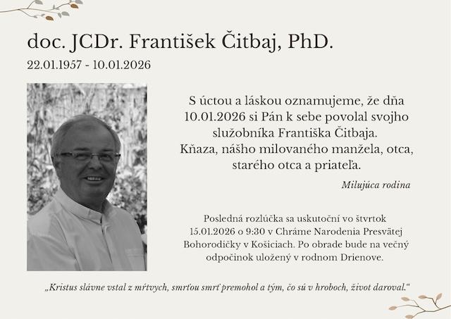 Košice 14. januára (TK KBS) Do večnosti odišiel v piatok 10. januára 2026 gréckokatolícky kňaz, mitroforný protojerej, vysokoškolský pedagóg a odborník na kánonické právo doc. František Čitbaj.