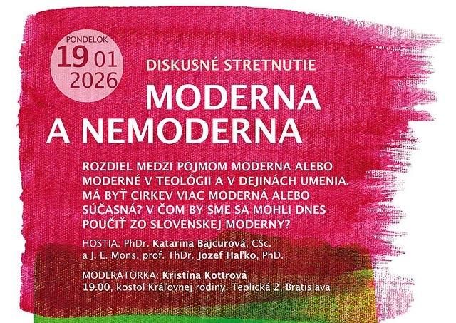 Bratislava 15. januára (TK KBS) V pondelok 19. januára 2026 sa v kostole Kráľovnej rodiny na Teplickej ul. v Bratislave bude konať ďalšia synodálna diskusia na tému „Moderna a nemoderna“. Aký je rozdiel medzi pojmom moderna alebo moderné v teológii a v dejinách umenia? Má byť Cirkev viac moderná alebo súčasná? Potrebuje Cirkev hľadať nový jazyk v umení alebo si vystačí s opakovaním overených foriem? V čom by sme sa mohli dnes poučiť zo slovenskej moderny? Pozvanie do diskusie prijal bratislavský pomocný biskup, Mons. prof. ThDr. Jozef Haľko, PhD. a teoretička umenia, riaditeľka Centra vied o umení Slovenskej akadémie vied, PhDr. Katarína Bajcurová, CSc.