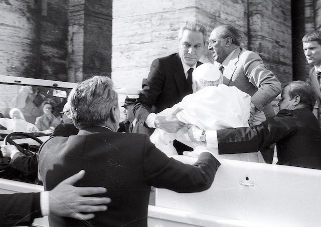 Angelo Gugel (vľavo) podopiera zraneného Jána Pavla II. po atentáte 13. mája 1981
