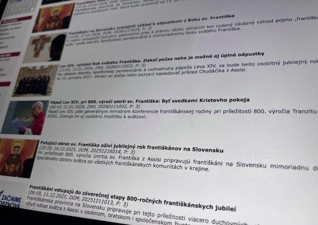 Bratislava 4. februára (TK KBS) Tlačová kancelária KBS (TK KBS) zverejnila na svojej internetovej stránke www.tkkbs.sk nový dossier venovaný Roku svätého Františka. Tento špeciálny zväzok bude postupne obsahovať správy a informácie o jeho aktivitách, ktorým sa bude venovať. Dossier má názov Rok sv. Františka. Umiestnený je na pravej strane časti stránky s názvom Top témy.