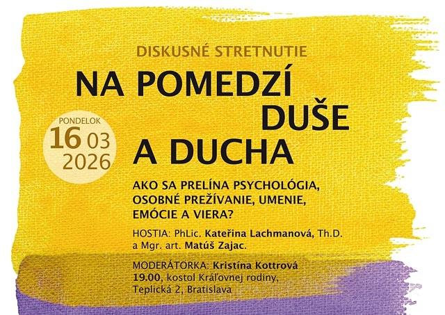 Bratislava 10. marca (TK KBS) V pondelok 16. marca 2026 o 19:00 sa v pastoračnom centre pri Kostole Kráľovnej rodiny na Teplickej ulici v Bratislave bude konať synodálna diskusia na tému „Na pomedzí duše a ducha“, venovaná otázkam, ako sa prelína osobné prežívanie s umením, emóciami a vierou. Pozvanie do synodálnej diskusie prijala teologička a psychologička Kateřina Lachmanová a dokumentárny fotograf Matúš Zajac. Moderovať ju bude Kristína Kottrová.