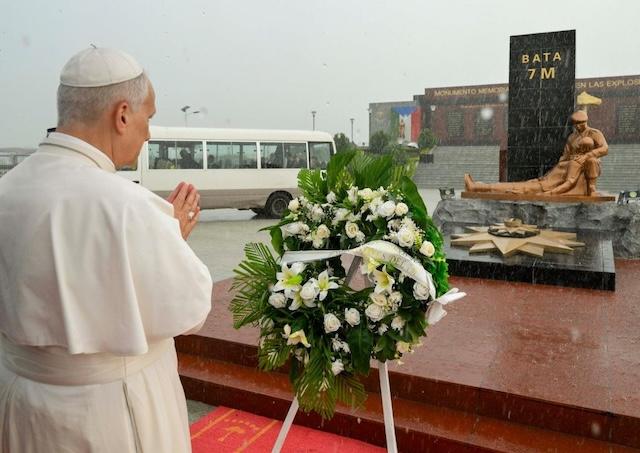 Po návšteve väznice v Bate zotrval pápež za neutíchajúceho dažďa v tichej modlitbe pri pamätníku obetí. Len čiastočne chránený dáždnikmi položil k päte pamätníka veniec kvetov. Následne nastúpil do vozidla, aby sa na miestnom štadióne stretol s mládežou a rodinami.